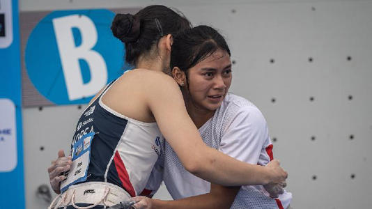 Kadek Adi Asih memeluk atlet panjat tebing putri Korea Jimin Jeong (kiri) usai beradu kecepatan pada perebutan posisi ketiga final speed putri seri ketiga IFSC Climbing World Cup 2025 di Pulau Peninsula, Nusa Dua, Bali, 3 Mei 2025. Sebelumnya pada kejuaraan internasional yakni IFSC Asia Continental Youth Cup 2023, Kadek berhasil meraih medali perunggu untuk disiplin speed putri junior di Singapura.